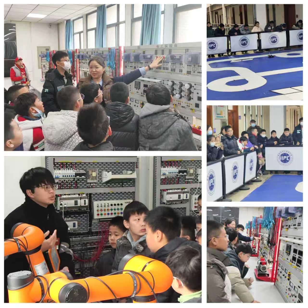 首先,同学们首先参观了工业机器人实验室。来自控制工程专业的研究生向同学们演示了智能机械臂的各种动作,并介绍了基本操作知识。随后,同学们又来到智能车训练赛道。来自电子信息工程专业的学生为同学们展示了智能小车日常训练的场景。介绍了实验的基本操作,强调了用电安全的重要性。接着,同学们来到电工电子实验室,由示范中心副主任张晓春向同学们介绍了电工电子技术发展史和常见电工设施。最后,张晓春主任带领同学们来到电工学实验室,引导同学们在电子技术基础实验箱上开展了 “数字计数器”的实验操作。孩子们兴致勃发,纷纷动手实践,科技的种子在孩子们的心中悄然萌发、落地生根。